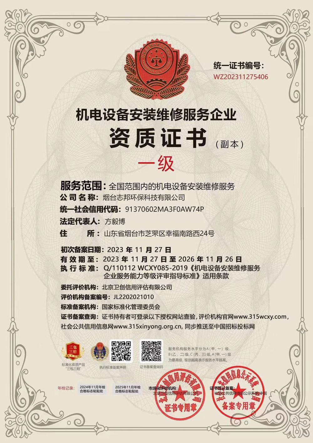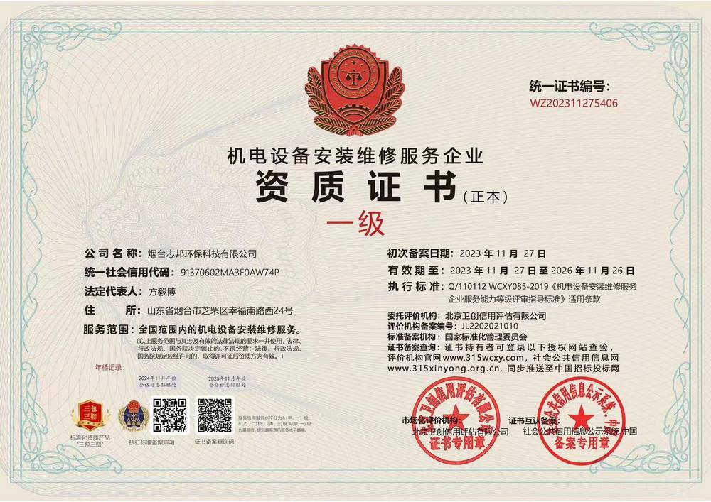 機電設備安裝維修服務企業(yè)資質證書 一級